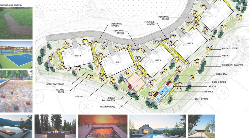 Multi-family condominium development in the private community of CDA National Reserve on the west side of Lake Coeur D’Alene, provides outdoor amenities and landscape for twenty-five residential units. Amenities include lap pool and spa, fire pit nooks, and low-voltage LED lighting provides a sense of comfort and security at night. Plantings are primarily native with a high efficiency irrigation system to supplement natural precipitation.